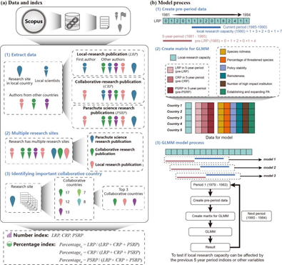 图1 论文技术流程图(a)从灵长类学研究中提取数据,定义研究类型,识别一篇出版物中出现多个研究地点的问题,确定对当地国家重要的合作国家,并计算不同研究类型的数量和百分比;(b)创建一个数据矩阵,其中包括当地研究出版物(LRP)、合作研究出版物(CRP)和降落伞科学研究(PSRP),并使用此矩阵构建广义线性混合模型(GLMM)。