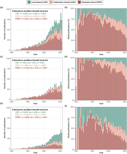 图2 对于所有灵长类动物分布国(a,b)、低至中等收入国家(c,d)以及高至中等偏上收入国家(e,f),1960 年至 2022 年期间发表的本土研究论文(LRP)、合作研究论文(CRP)和降落伞科学研究(PSRP)的数量以及占总发表论文数量的百分比(tau,Mann–Kendall tau)。