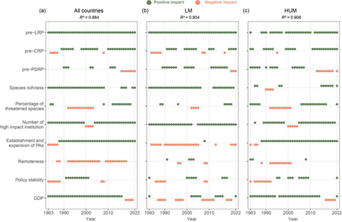 图4 过去 5 年发表的文章对本土研究(LRPs)产生的影响(积极和消极),考虑了 6 个因素,并基于广义线性混合效应模型(GLMM)进行模拟。我们划分三组,分别是(a)所有灵长类动物分布国家(所有国家)、(b)低至中等收入国家(LM)以及(c)高至中等偏上收入国家(HUM)。其中:pre-LRP,过去 5 年发表的当地研究文章;pre-CRP,过去 5 年发表的合作研究文章;pre-PSRP,过去 5 年发表的“降落伞科学”文章;PAs,保护区;GDP,国内生产总值。