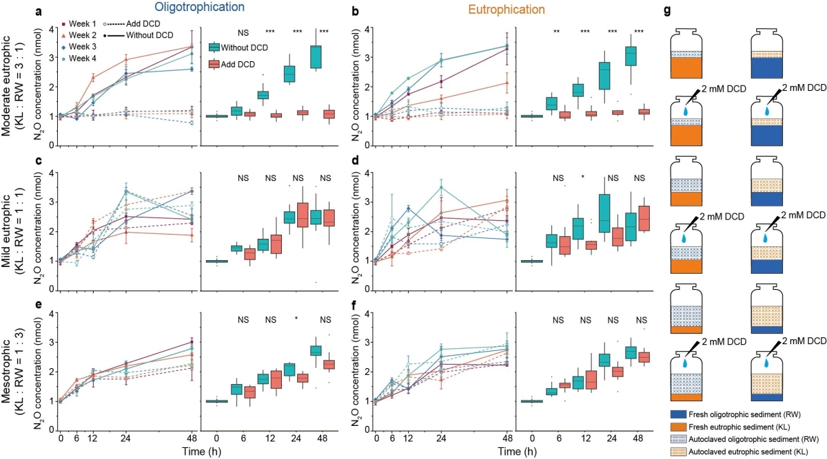 图3. 通过沉积物交叉接种实验模拟湖泊富营养化和寡营养化过程,证实了营养水平对沉积物N2O产生途径的调控