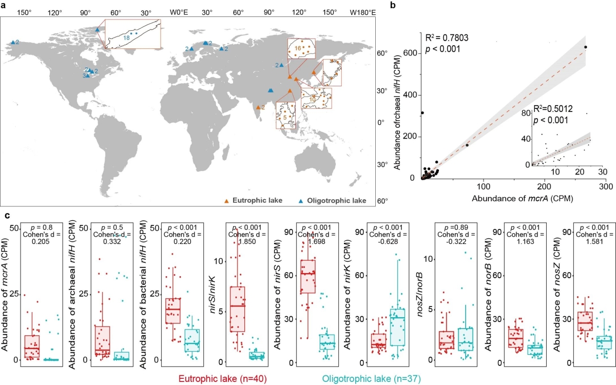 研究结果表明,全球湖泊沉积物中产甲烷基因mcrA与古菌固氮基因nifH显著正相关(p < 0.01),但两者丰度与湖泊营养状态无关,表明湖泊沉积物中古菌产甲烷与固氮耦合,但CH4释放受多因子影响。