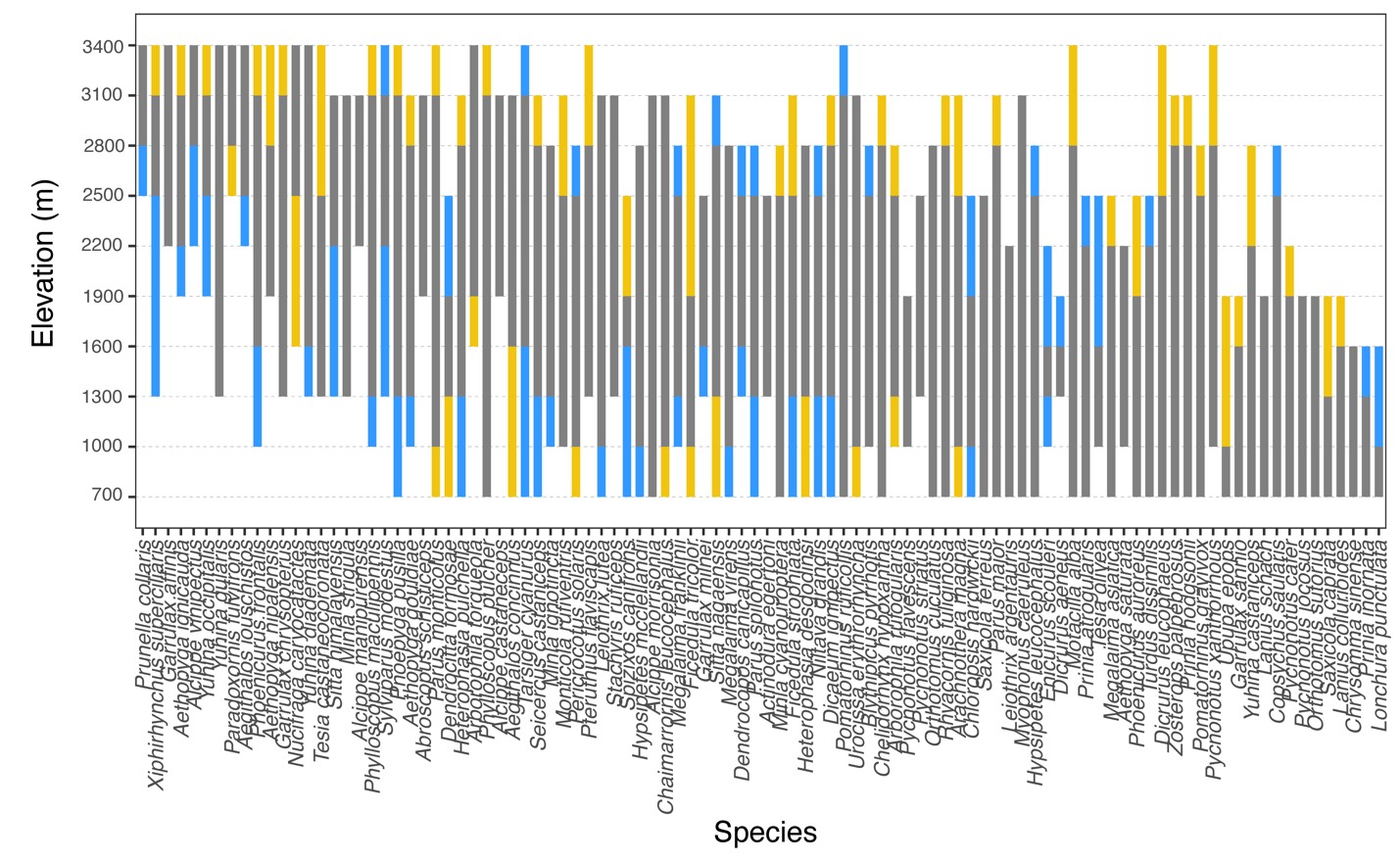 高黎贡山97种鸟类的海拔分布随季节的变化。黄色:仅繁殖季节分布的海拔带;蓝色:仅冬季分布的海拔带;灰色:两个季节均有分布的海拔带。