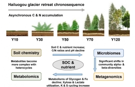 气候变暖正威胁陆地生态系统生物多样性和土壤碳储量,因此我们以海螺沟冰川退缩形成的土壤时间序列为研究对象,采用微生物多组学相结合的技术手段,阐明了冰川退缩导致的土壤碳氮积累不同步现象,决定了土壤发育过程中与碳氮循环相关的土壤微生物群落结构和代谢功能的分化(图1)。