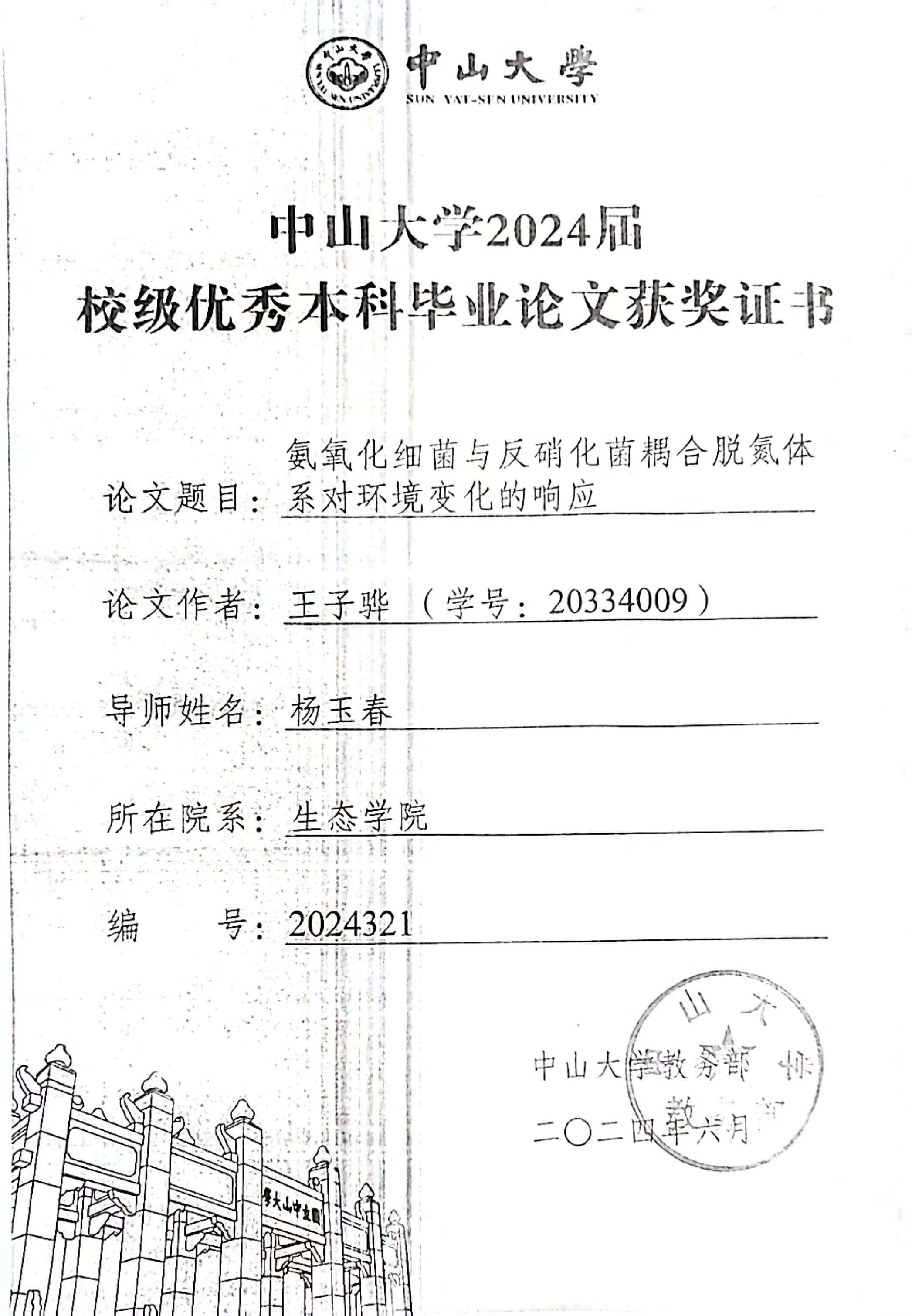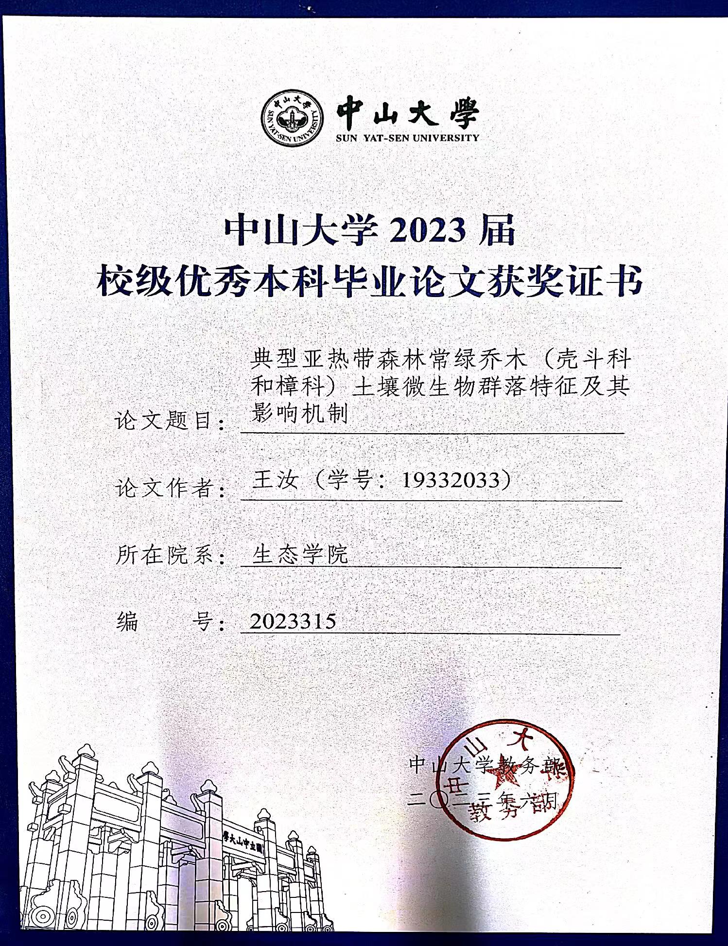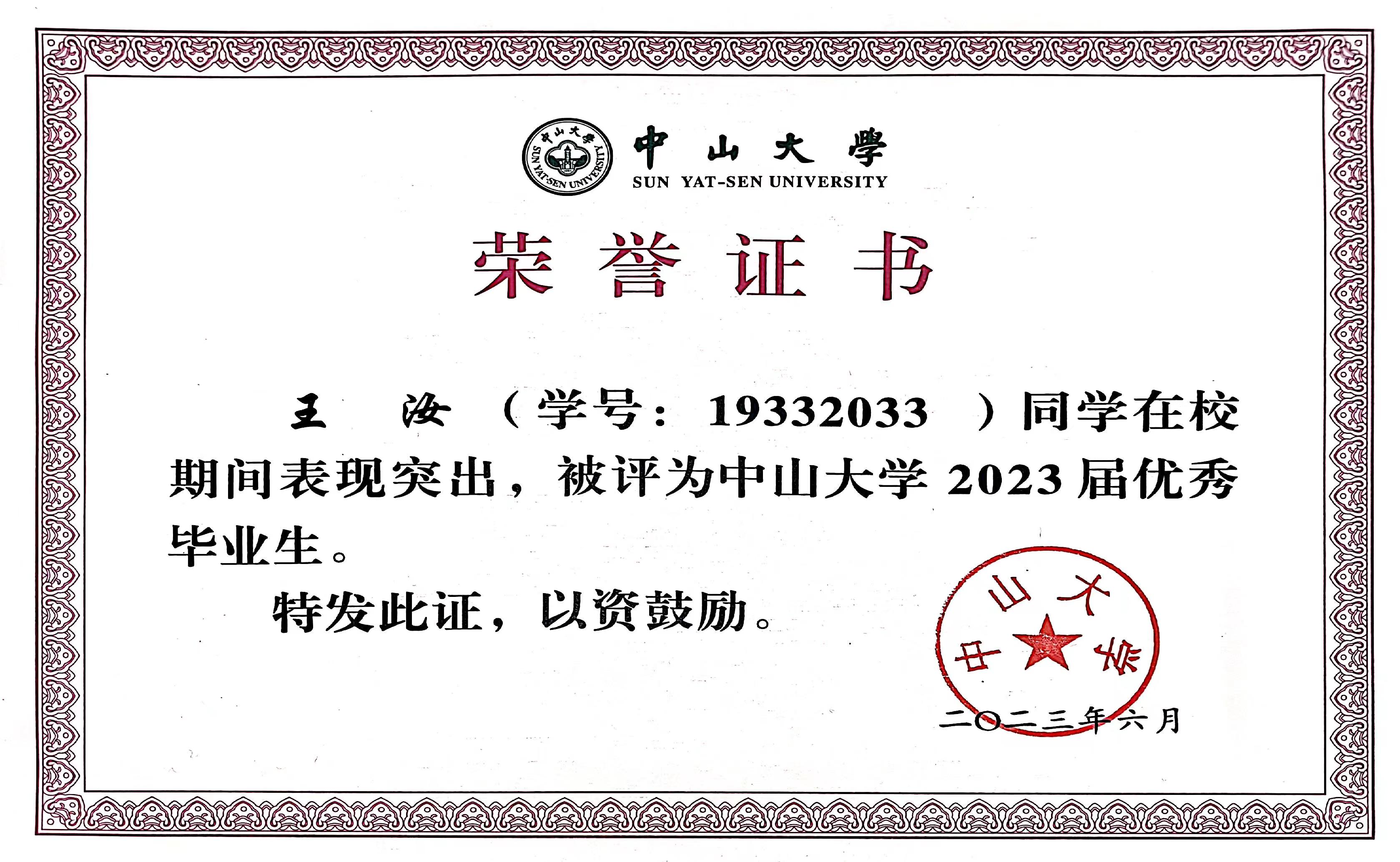 - 指导学生获中山大学“优秀毕业生”