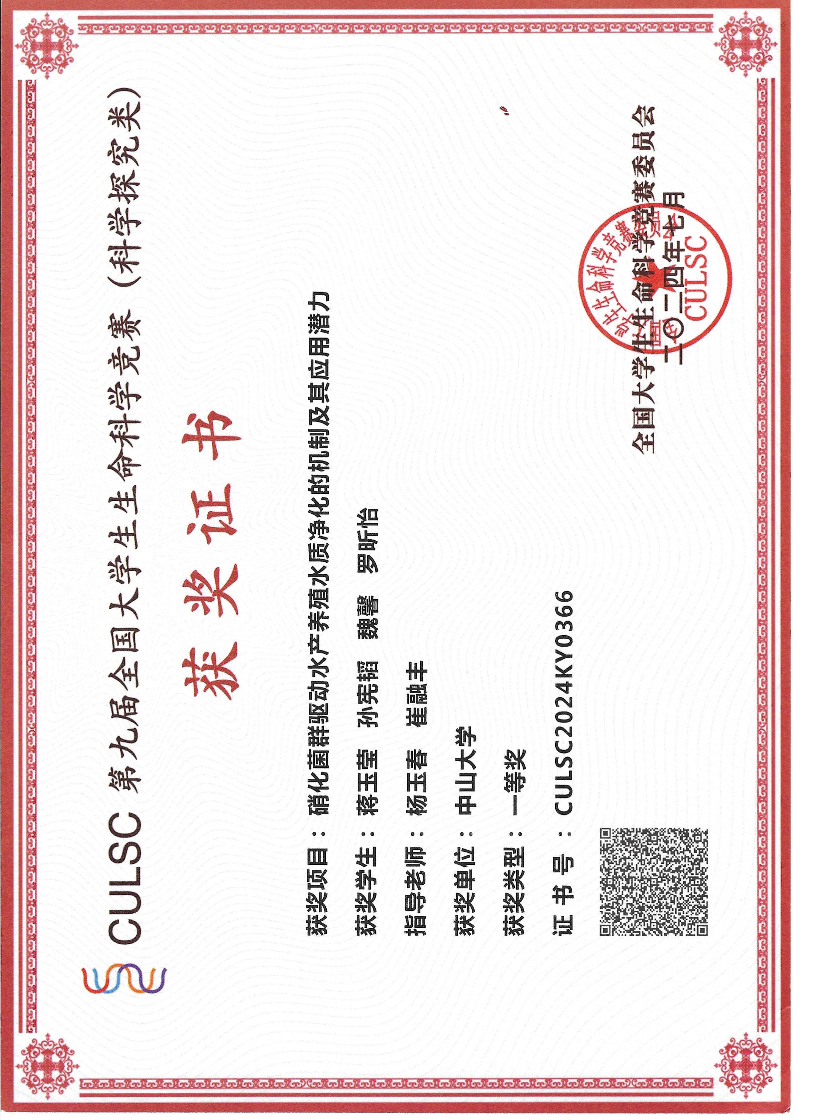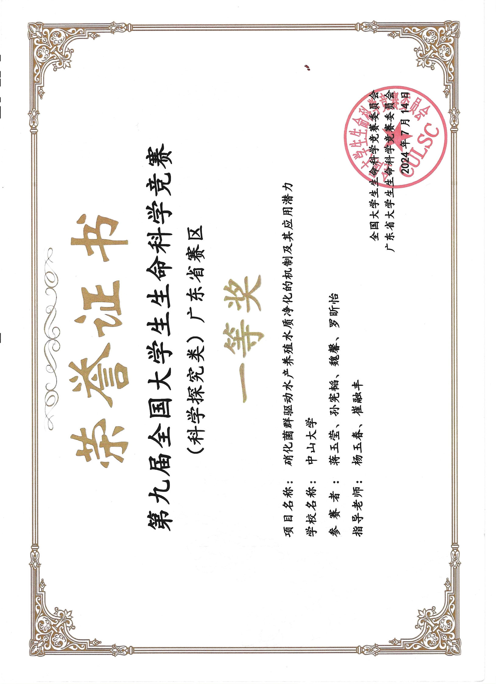 - 指导学生获《全国大学生生命科学竞赛》广东省赛区“一等奖”和国赛“一等奖”